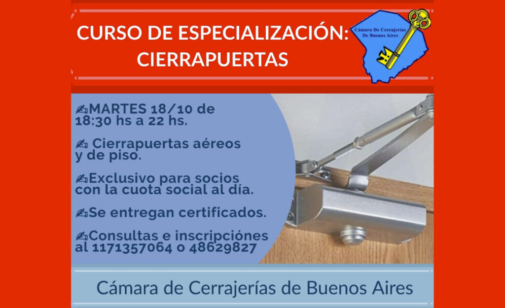 06 Ago 2022 CURSO DE ESPECIALIZACIÓN SOBRE CIERRAPUERTAS 6 agosto, 2024 By Yamila Patelli El martes 18 de Octubre de 18:30 a 22 horas, se dictará en nuestra sede social el CURSO DE ESPECIALIZACIÓN SOBRE CIERRAPUERTAS. Es nece...Continue reading