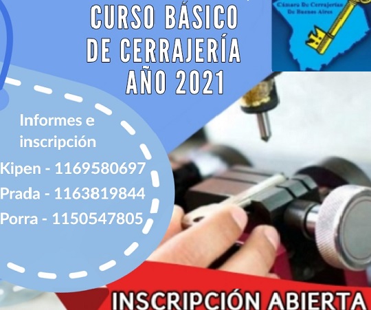 06 Ago 2021 CURSO BÁSICO DE CERRAJERÍA 2021 6 agosto, 2024 By Yamila Patelli Tenemos el agrado de informar que este año retomaremos con el curso de cerrajería en forma presencial, con cupos limitados y estricto p...Continue reading