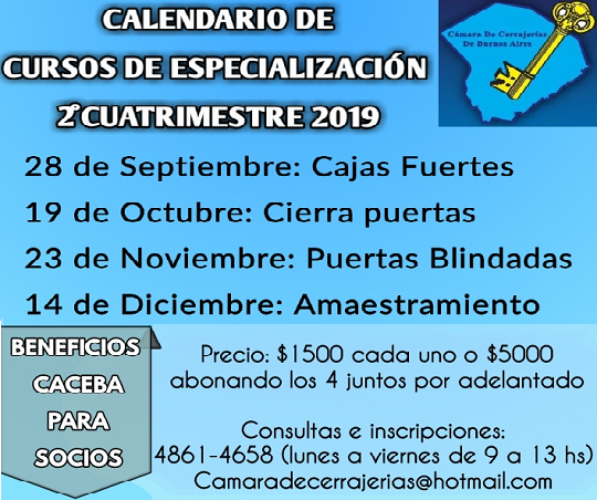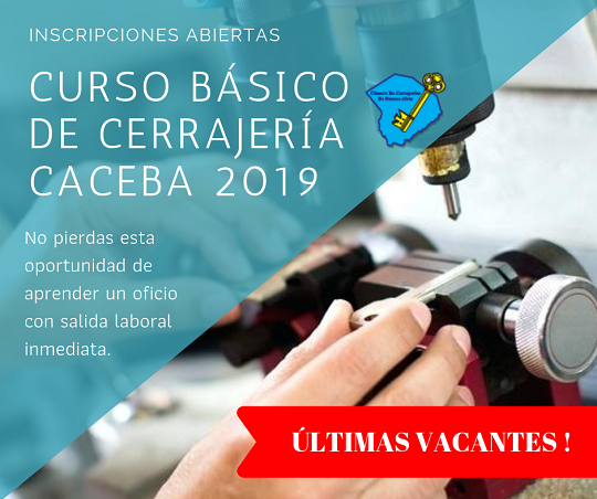04 Ago 2019 CURSO BÁSICO DE CERRAJERÍA 2019 4 agosto, 2024 By Yamila Patelli ÚLTIMAS VACANTES. NO PIERDA LA OPORTUNIDAD! ABIERTA LA INSCRIPCIÓN El curso de cerrajería se dictará en nuestra sede s...Continue reading