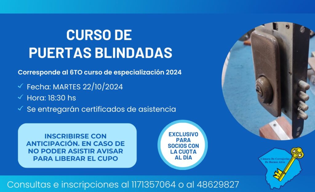 24 Oct 2024 CURSO DE PUERTAS BLINDADAS 24 octubre, 2024 By Yamila Patelli Se llevó a cabo el martes 22/10 en nuestra sede social, en el marco de los cursos de especialización 2024 Compartimos las f...Continue reading